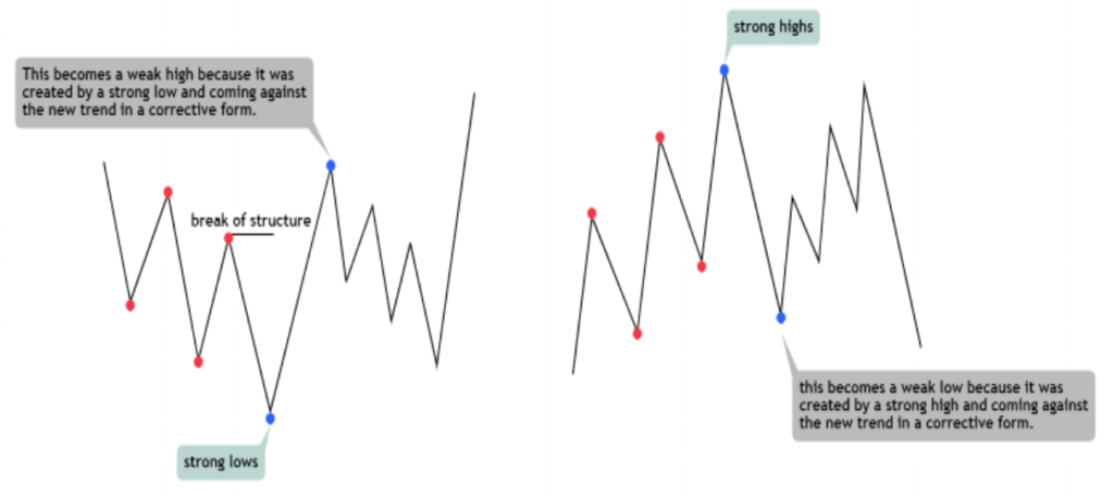 Contrastando com os topos e fundos fortes, os fracos são caracterizados por rejeições mais leves e movimentos mais lentos. Estes geralmente representam movimentos corretivos, retornando ao desconto ou prêmio da zona do topo/fundo forte anterior.