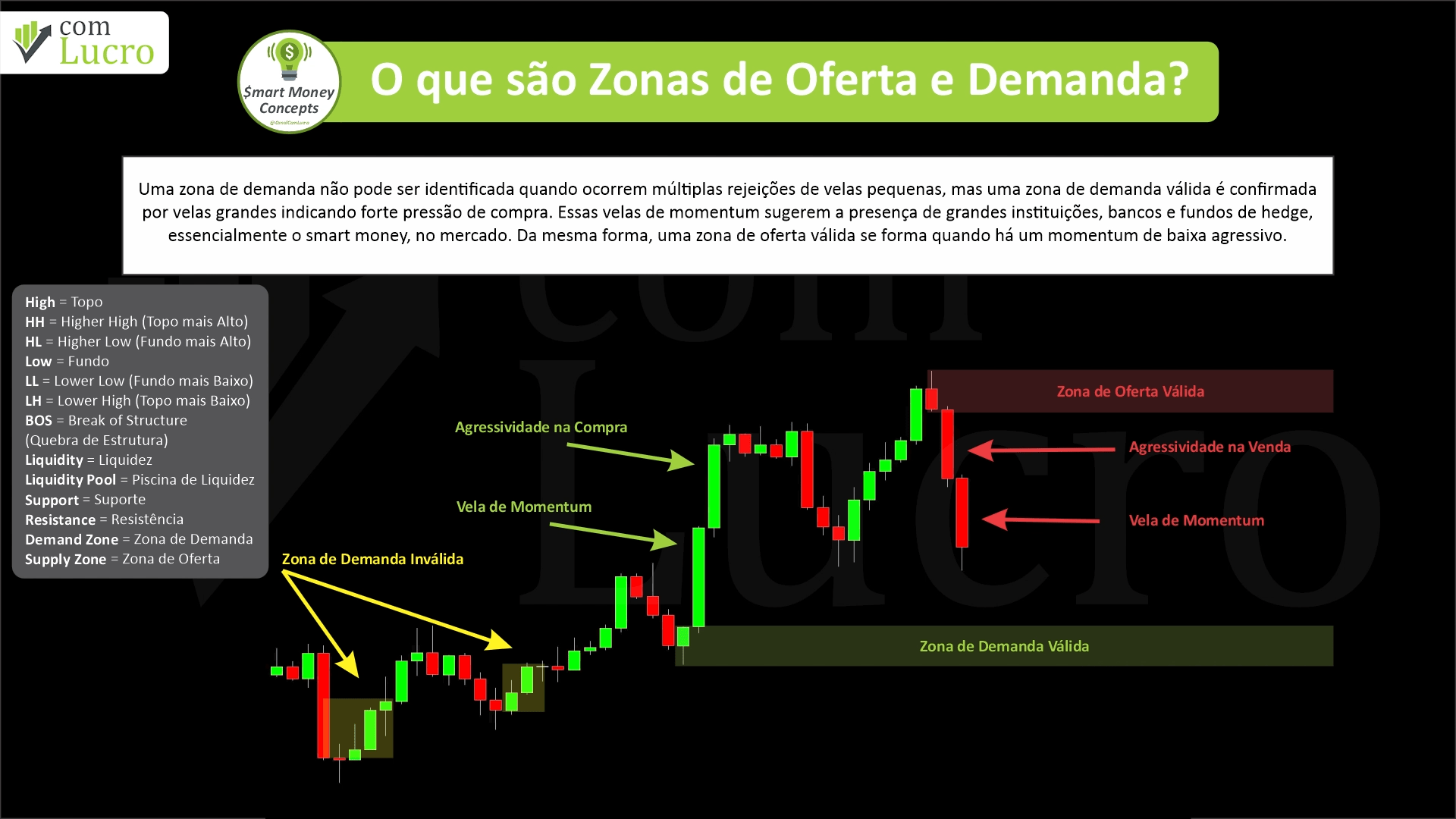 Zonas de Oferta e Demanda, Conceitos de Smart Money, Suporte e Resistência, Fair Value Gaps (FVG), Quebra de Estrutura (BOS), Blocos de Ordens, Fluxos de Ordens, Áreas de Consolidação, Relação Risco-Recompensa, Estrutura de Mercado, ComLucro, Trader, Trading, Investimentos, Ibovespa, Fintwit, Mercado Financeiro, Day Trade, Swing Trade